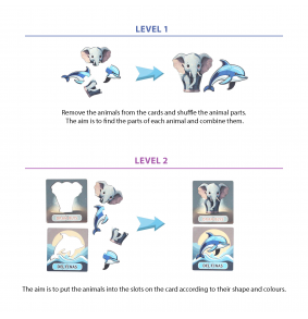 25,49 €10 medinių kortelių su gyvūnėlių piešiniais ir pavadinimu. Lavinamasis žaidimas skirtas ikimokyklinio amžiaus vaikams. Tai yra 4 lygių žaidimas. Parinkite lygi pagal vaiko amžių ir sugebėjimus. 1 lygis: Išimkite gyvūnėlius iš kortelių ir sumaišykite gyvūnėlių dalis. Tikslas surasti kiekvieno gyvūnėlio abi dalis ir sujungti. 2 lygis: Tikslas sudėti gyvūnėlius į kortelėje esančias angas pagal formą ir spalvas. 3 lygis: Tikslas surasti ir sudėti gyvūnėlius į korteles pagal gyvūno pavadinimą. 4 lygis: Išimkite žodžius ir gyvūnėlius iš kortelių ir viską sumaišykite. Tikslas sudėti visus gyvūnėlius ir jų pavadinimus į korteles. -