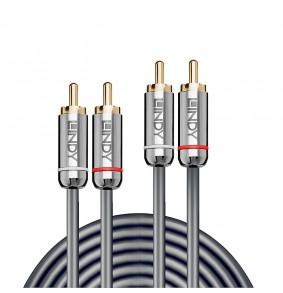5m dual phono audio kabelis su žalvariniais jungtimis ir chromu dengtomis dalimis. Jis turi termoplastinės elastomerinės medžiagos apvalkalą ir veikia temperatūros diapazone nuo -20°C iki 80°C.