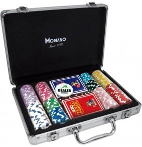Rinkinį sudaro 200 vnt. 14g pokerio žetonų, du plastikiniai pokerio kortų kaladės ir aliumininis dėklas. Bendras svoris yra 3885g, tai autentiškas Modiano produktas, pagamintas Kinijoje.