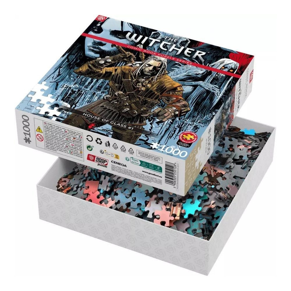 Sudėtingas 1000 dalių dėlionė, skirta 14 metų ir vyresniems. Išmatavimai: 480 mm pločio ir 680 mm aukščio, su saugos įspėjimais dėl mažų dalių.