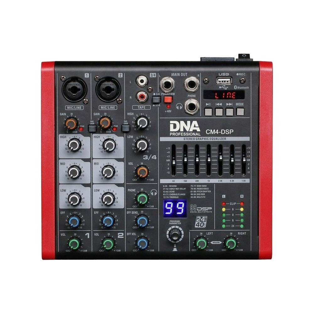 DNA CM4-DSP yra kompaktiškas garso mikseris su keturiais kanalais, turintis „Bluetooth“ ryšį ir integruotą MP3 grotuvą. Jis siūlo įvairius garso efektus, 48V fantominį maitinimą ir kelias įvesties/išvesties parinktis, įskaitant XLR ir RCA.