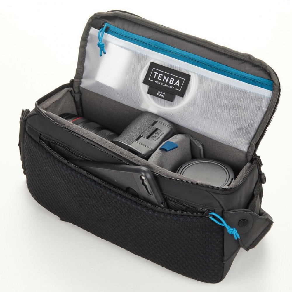 Tenba Axis v2 6L Sling krepšys sukurtas nešioti be veidrodinę arba DSLR kamerą su 2-3 objektyvais ir taip pat tinka DJI Mavic dronui. Jame yra atminties putų diržas patogumui, apatiniai diržai trikojui ir paslėpta kišenė „Bluetooth“ sekikliui.
