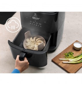 Electrolux EAF7SB yra 6.9 L karšto oro fritiūrinė su 1700 W galia. Ji turi kelias virimo funkcijas, įskaitant kepimą, grilinimą, kepimą orkaitėje ir džiovinimą, su temperatūros diapazonu nuo 40 °C iki 200 °C ir 90 minučių laikmačiu.