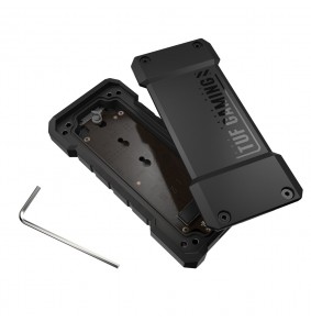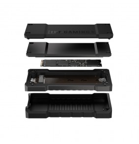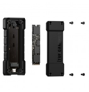 ASUS TUF Gaming A2 SSD korpusas palaiko M.2 atminties įrenginius su maksimaliu 4 TB talpos ir siūlo duomenų perdavimo greitį iki 20 Gbit/s. Jis pasižymi IP68 klasės aliuminio dizainu, užtikrinančiu patvarumą ir apsaugą nuo dulkių bei vandens.