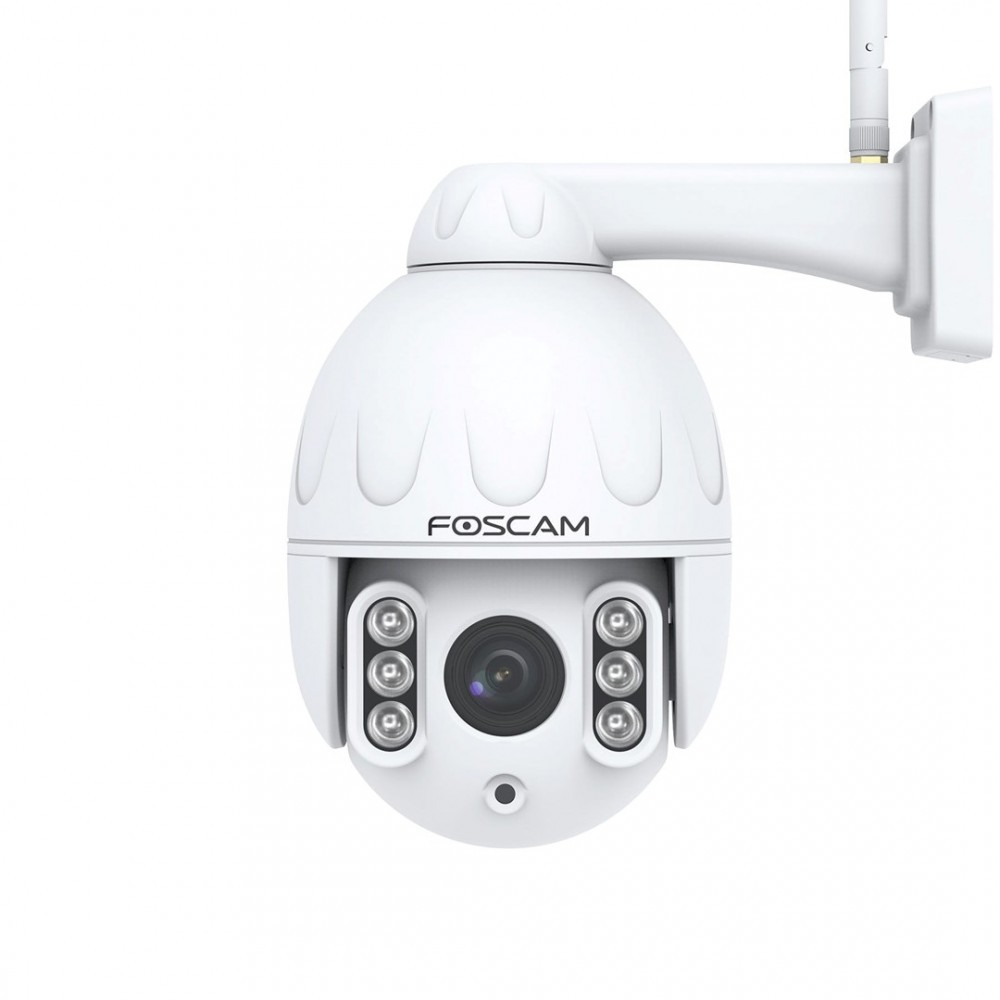 IP kamera FOSCAM SD4 turi 4 MP CMOS jutiklį su 2304 x 1536 maksimalia raiška ir 4x optiniu priartinimu. Ji siūlo naktinį matymą iki 50 metrų, IP66 atsparumo vandeniui reitingą ir palaiko Wi-Fi bei Ethernet ryšį.