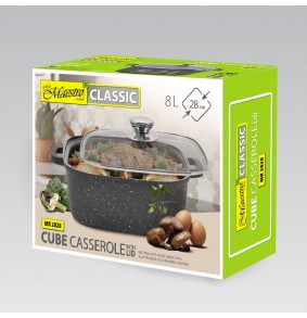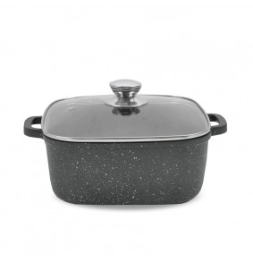 28 cm kvadratinis puodas su dangčiu ir 8 litrų talpa, tinkamas įvairiems viryklės tipams, įskaitant dujinę ir indukcinę. Ypatybės: nelipni danga, dvi rankenos ir suapvalinti kraštai, kad būtų lengviau naudotis.