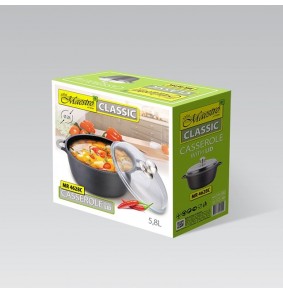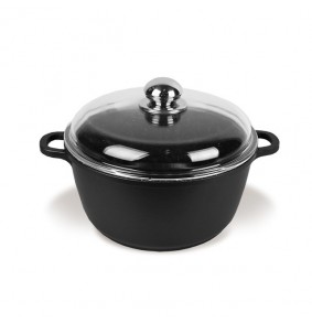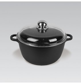 Apvalus juodas puodas su dangčiu, 28 cm skersmens ir 5.8 l talpos. Turi nelipnią dangą ir tinka įvairiems virimo paviršiams, įskaitant indukcinius.