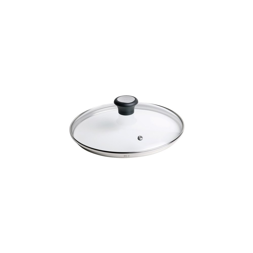 Apvalus stiklinis keptuvės dangtis su nerūdijančio plieno kraštu ir juodu plastiko rankena. Jame yra garo anga, jis tinka plauti indaplovėje, o skersmuo yra 26 cm.