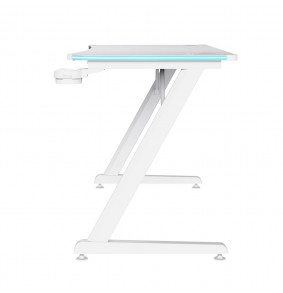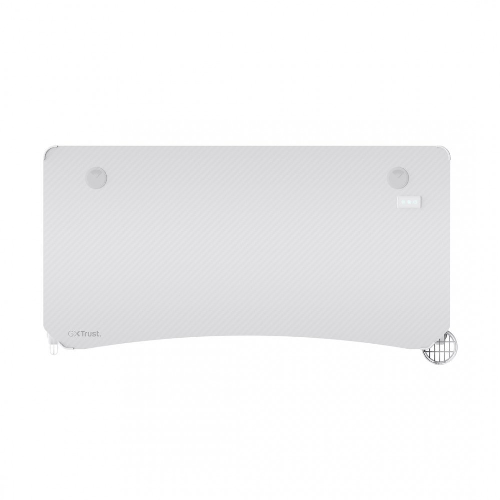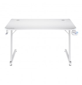 Trust GXT 709W LUMINUS Balta yra žaidimų stalas, sukurtas su mediniu stalviršiu ir Z formos kojomis, palaikančiomis maksimalų svorį iki 150 kg. Jame yra LED apšvietimas, kabelių valdymas, taip pat įmontuota ausinių kabykla ir butelių laikiklis.