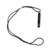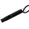 Juodas aliuminis savisaugos švilpukas, 65 mm ilgio ir sveriantis 28 g. Ypatybės: garsus signalas, kabinimo dizainas ir pridėta virvutė.