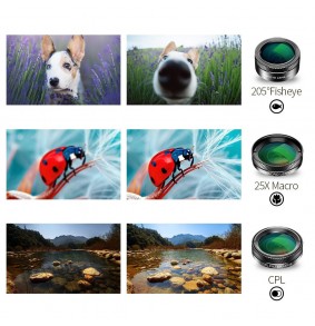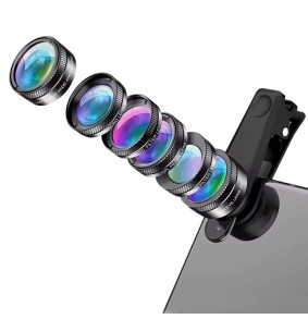 Apexel APL-DG6 yra 6-in-1 telefono objektyvų rinkinys, kuris apima 140° plataus kampo objektyvą, 205° žuvies akies objektyvą ir 20x makro objektyvą. Taip pat jame yra CPL poliarizacinis filtras, ND32 ND filtras ir x4 žvaigždžių filtras, visi pagaminti iš optinio stiklo su antirefleksinėmis danga.