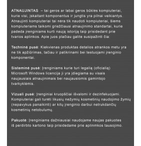 ATNAUJINTAS – tai geros ar labai geros būklės kompiuteriai, kurie visi, įskaitant komponentus ir jungtis yra pilnai veikiantys. Atnaujinti kompiuteriai tai nėra tik naudoti kompiuteriai, šiems kompiuteriams taikomi griežčiausi atnaujinimo standartai, kurie padeda įrenginiams kurti naują istoriją, taip prisidedant prie tvarios aplinkos. Apie juos plačiau galite susipažinti čia: