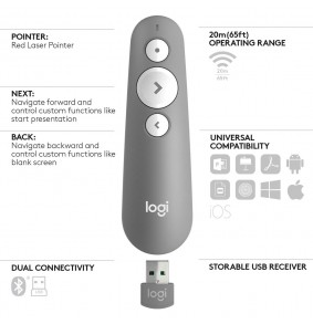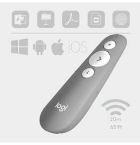 Logitech R500 Lazerinis Pristatymo Nuotolinio Valdymo Pultas yra kompaktiškas, belaidis įrenginys, sukurtas pristatymams ir demonstracijoms. Jis pasižymi raudonu lazeriniu žymekliu su reguliuojamu galingumu ir patvariu dizainu.