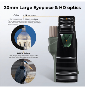 K&F Concept BaK-4 12x50 teleskopas turi 12x priartinimą ir 50 mm objektyvo diafragmą, suteikiančią 87 metrų matymo lauką 1,000 metrų atstumu. Jis yra atsparus vandeniui pagal IP68 standartą, sveria 418 g ir komplektuojamas su riešo dirželiu, apsauginiu dėklu ir valymo šluoste.