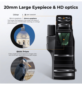 K&F Concept BaK-4 12x50 teleskopas turi 12x priartinimą ir 50 mm objektyvo diafragmą, suteikiančią 87 metrų matymo lauką 1,000 metrų atstumu. Jis yra atsparus vandeniui pagal IP68 standartą, sveria 418 g ir turi 1/4" trikojį srieginį laikiklį.