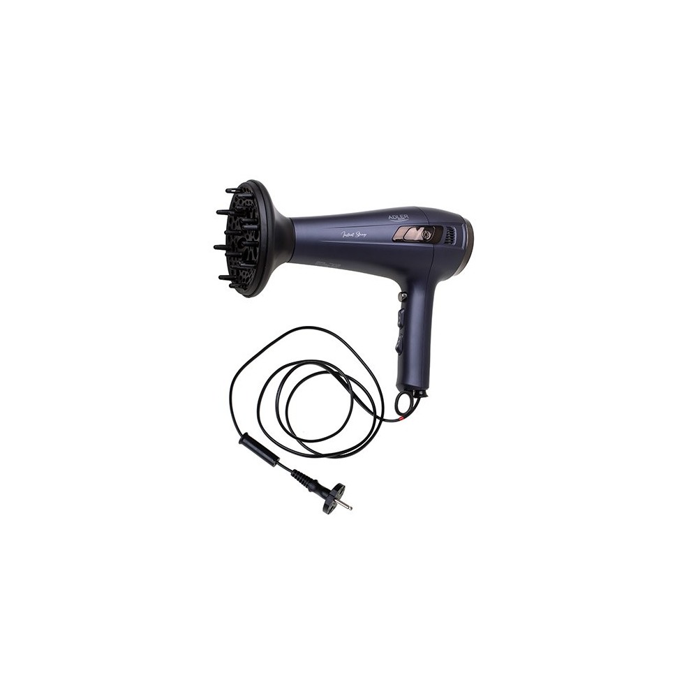 Adler AD 2273 plaukų džiovintuvas turi tris šildymo lygius ir du greičio nustatymus, taip pat joninę funkciją ir šalto oro mygtuką. Jame yra difuzorius ir koncentratorius, o 1,5 m ilgio laidas užtikrina patogumą.