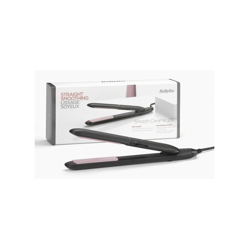 BaByliss CERAMIC 230 plaukų tiesintuvas turi keramikos plokšteles ir reguliuojamą temperatūrą nuo 200 °C iki 230 °C. Jame yra 360° sukamoji bazė ir 1.8 m sukamojo laido patogiam naudojimui.