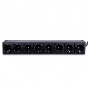 1.5U 8 Schuko lizdai suteikia maksimalią bendrą galią iki 3500W, skirta iki 8 prietaisų su individualiais jungikliais ir apsauga nuo perkrovos. Įrenginys turi 2 m ilgio kabelį, veikia 250VAC 16A ir yra skirtas horizontaliam montavimui 19 colių stelaže.
