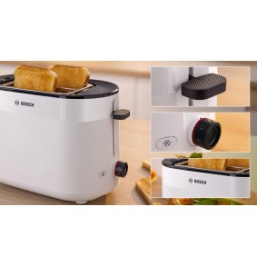Bosch TAT2M121 skrudintuvas yra aukštos kokybės prietaisas, skirtas 2 riekelėms, su kintama plutos parudimo kontrole ir pažangiomis atšildymo bei pakartotinio šildymo funkcijomis.