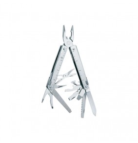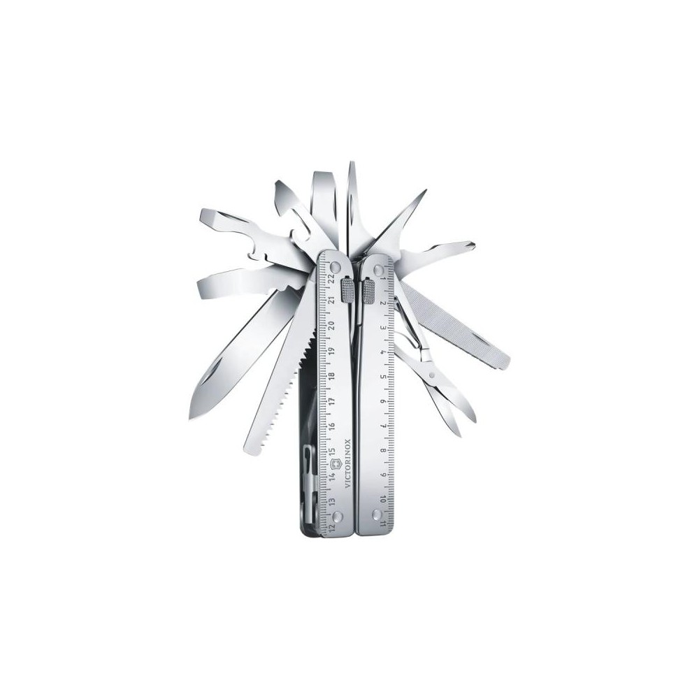 Victorinox SwissTool X Plus turi 39 funkcijas ir yra komplektuojamas su odiniu dėklu. Multitool matmenys yra 130 x 55 x 50 mm, o spalva - juoda.