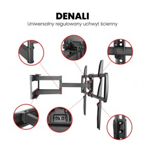 Montis TV laikiklis „DENALI“ palaiko ekranus nuo 37" iki 105" su maksimaliu svorio pajėgumu 75 kg. Jis pasižymi lengvu montavimu, reguliuojamu nuolydžiu ir apsaugos nuo vagystės funkcija.