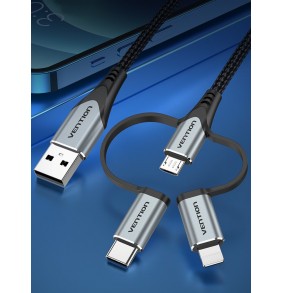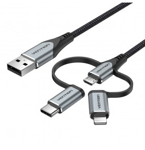 Vention USB 2.0 A Male į 3-in-1 Micro-B, USB-C ir Lightning Male Kabelis yra 1 metro ilgio ir palaiko maksimalų išėjimo srovę iki 2.4 A. Jis turi maksimalų duomenų perdavimo greitį iki 480 Mbit/s ir pagamintas iš nailono bei termoplastinio elastomero medžiagų.