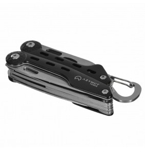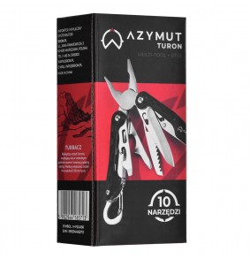 Multitool AZYMUT Turon turi 10 įrankių, tokių kaip replės, peilis ir medienos pjovimo peiliukas. Jis komplektuojamas su karabinė, diržo dėklu ir pagamintas iš nerūdijančio plieno su odiniu dėklu.