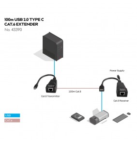 USB 2.0 Type C pratęsimas palaiko maksimalų atstumą iki 100m su 480Mbps pralaidumu naudojant Cat. 5e/6 UTP tinklo kabelį. Jame yra siųstuvas su USB Type C įvestimi ir RJ45 išvestimi, bei imtuvas su RJ45 įvestimi ir USB Type A išvestimi.