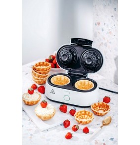 VAFLIŲ DUBENĖLIŲ KEPTUVAS ADLER AD 3062 sukurtas vaflių dubenėliams gaminti su nelipnia danga, kad būtų lengva išimti. Jis veikia 1400 W galia su 230 V AC įtampa ir turi neslystančias kojas stabilumui naudojimo metu.