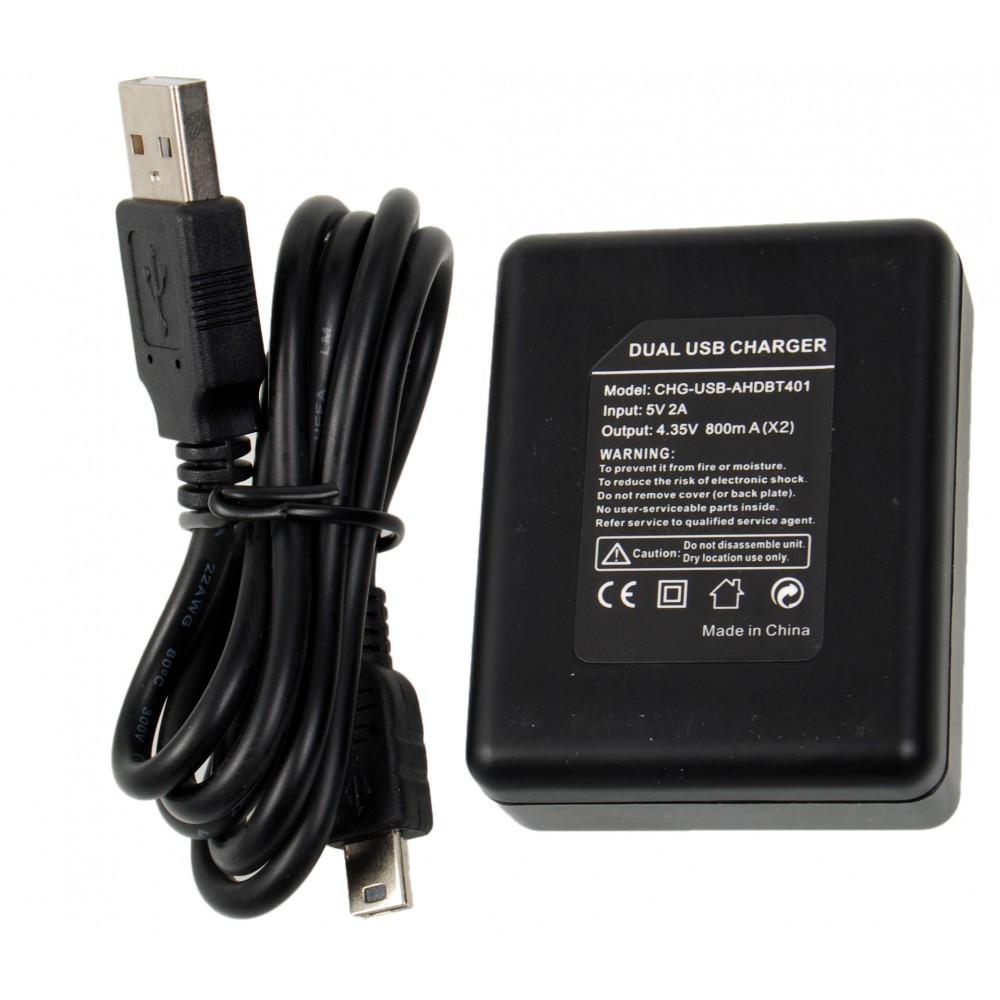 CHG - USB - AHDBT401 juodas dvigubas USB baterijų įkroviklis, skirtas GoPro Hero 401 Pagrindinės savybės: - Dvigubas USB akumuliatoriaus įkroviklis skirtas specialiai GoPro 401 - Įvestis: 5V 2A - Išvestis: 4,35V 800mA (x 2) - Apsauga nuo perkrovimo, kelių apsaugos grandinė - Raudona lemputė rodo įkrovimo būseną, o žalia - visiškai įkrautą - Nešiojamas USB įkrovimo prievadas Svoris: 0,079 kg Pakuotės svoris: 0,085 kg Gaminio dydis (ilgis x plotis x auktis): 5,80 x 4,30 x 1,70 cm / 2,28 x 1,69 x 0,67 colio pakuotės dydis (P x P x A): 7,50 x 6,50 x 3,50 cm / 2,95 x 2,56 x 1,38 colio Pakuotės turinys: 1 x dvigubas USB įkroviklis, skirtas GoPro Hero 401, 1 x USB laidas