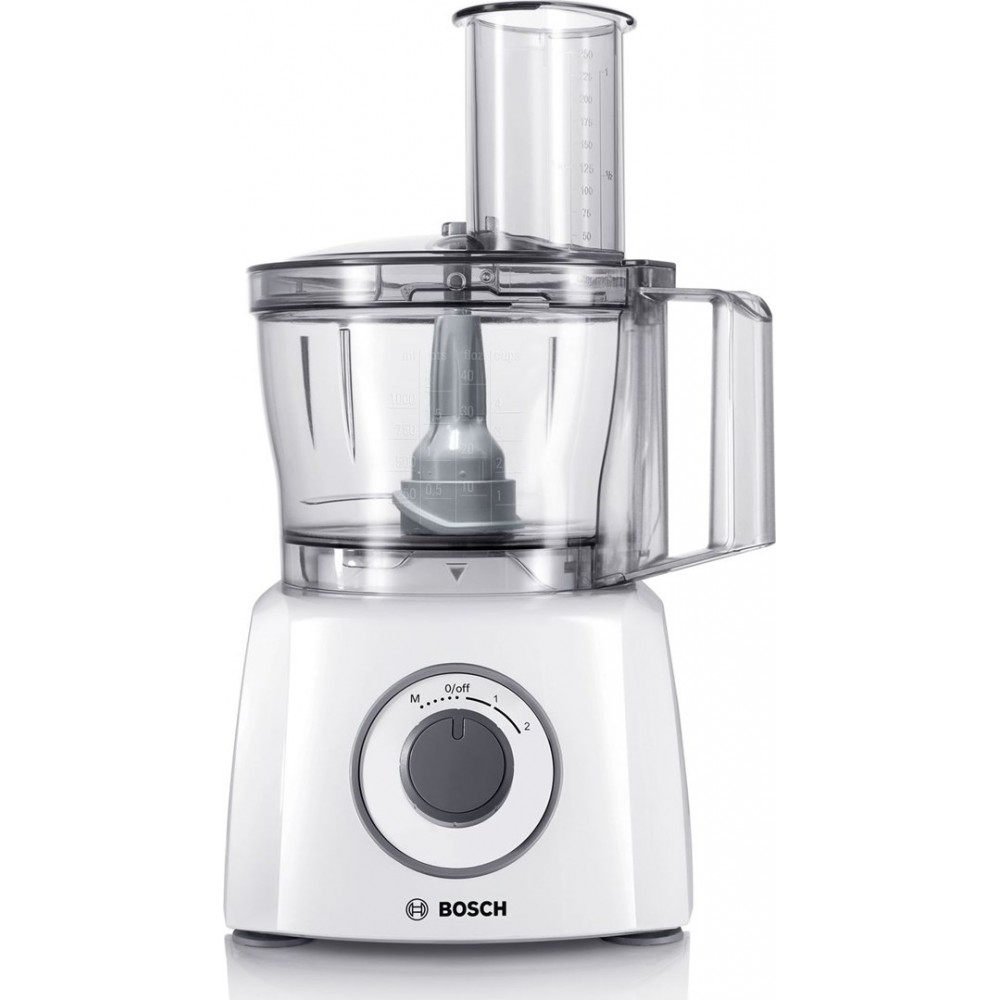 Bosch MCM3200W maisto smulkintuvas turi 800 W variklį ir 2.3 L talpos dubenį. Jame yra kintamo greičio valdymas, trys diskai, taip pat nerūdijančio plieno peilis, mini smulkintuvas ir trintuvės antgalis.
