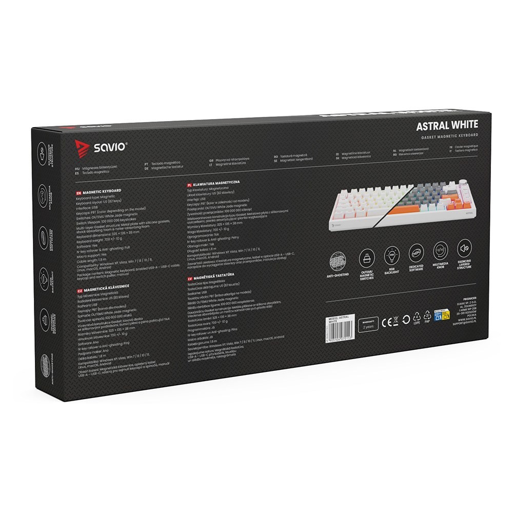 Savio ASTRAL WHITE JADE klaviatūra yra be numerių klaviatūra su RGB LED apšvietimu ir USB Type-C jungtimi. Ji turi 82 klavišus, multimedijos klavišus ir yra suderinama su Windows, Mac ir Linux operacinėmis sistemomis.